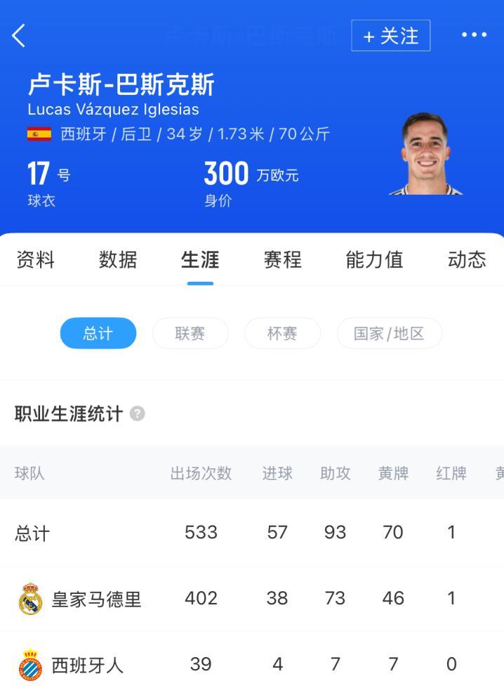 身高1.73米的巴斯克斯在2024/25赛季为皇马发挥了关键作用,他代表球队出战53场正式比赛,其中32场为西甲,10场为欧冠。这位球员总计为皇马出场402次,职业生涯共夺得23个冠军。