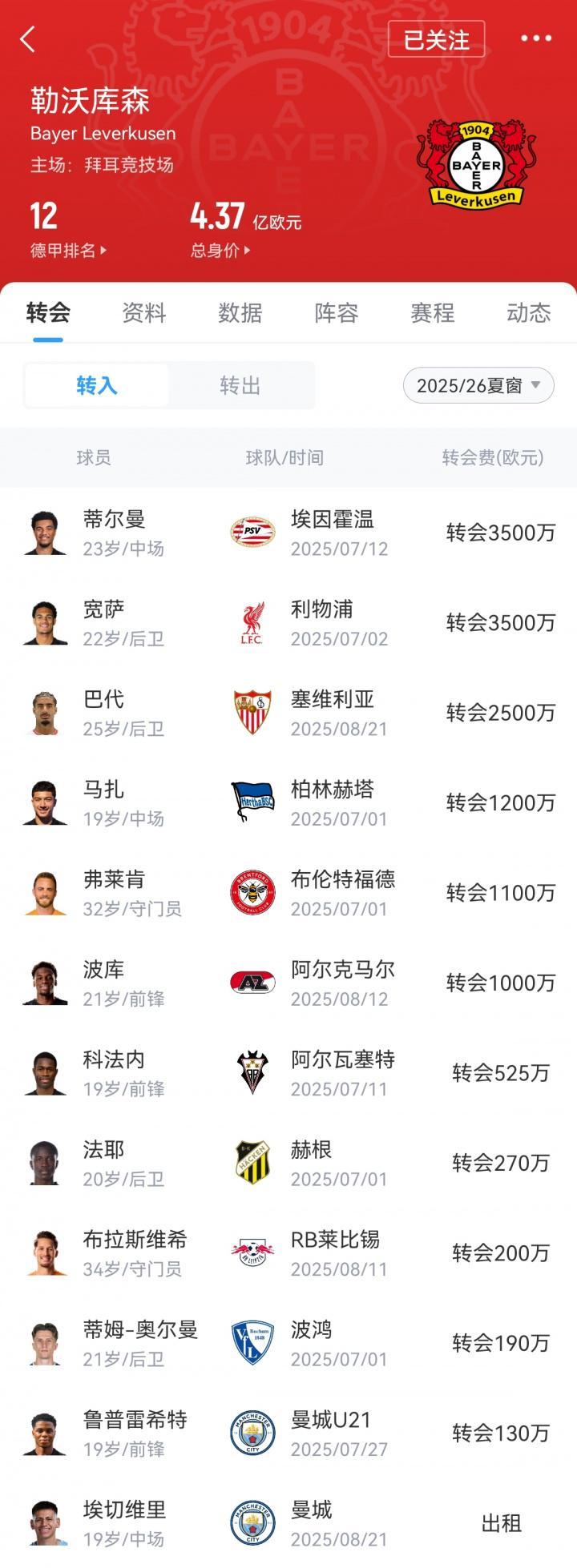 勒沃库森夏窗引援