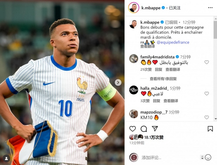 赛后姆巴佩在社交媒体分享赛场瞬间,配文称:"世预赛取得理想开端,已为周二主场再战做好充分准备。"