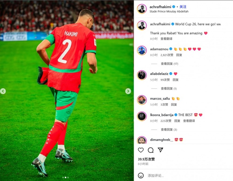赛后队长阿什拉夫在社交媒体分享比赛瞬间,并写道:“2026世界杯,我们晋级了!致谢拉巴特全场,你们的热情无与伦比!”